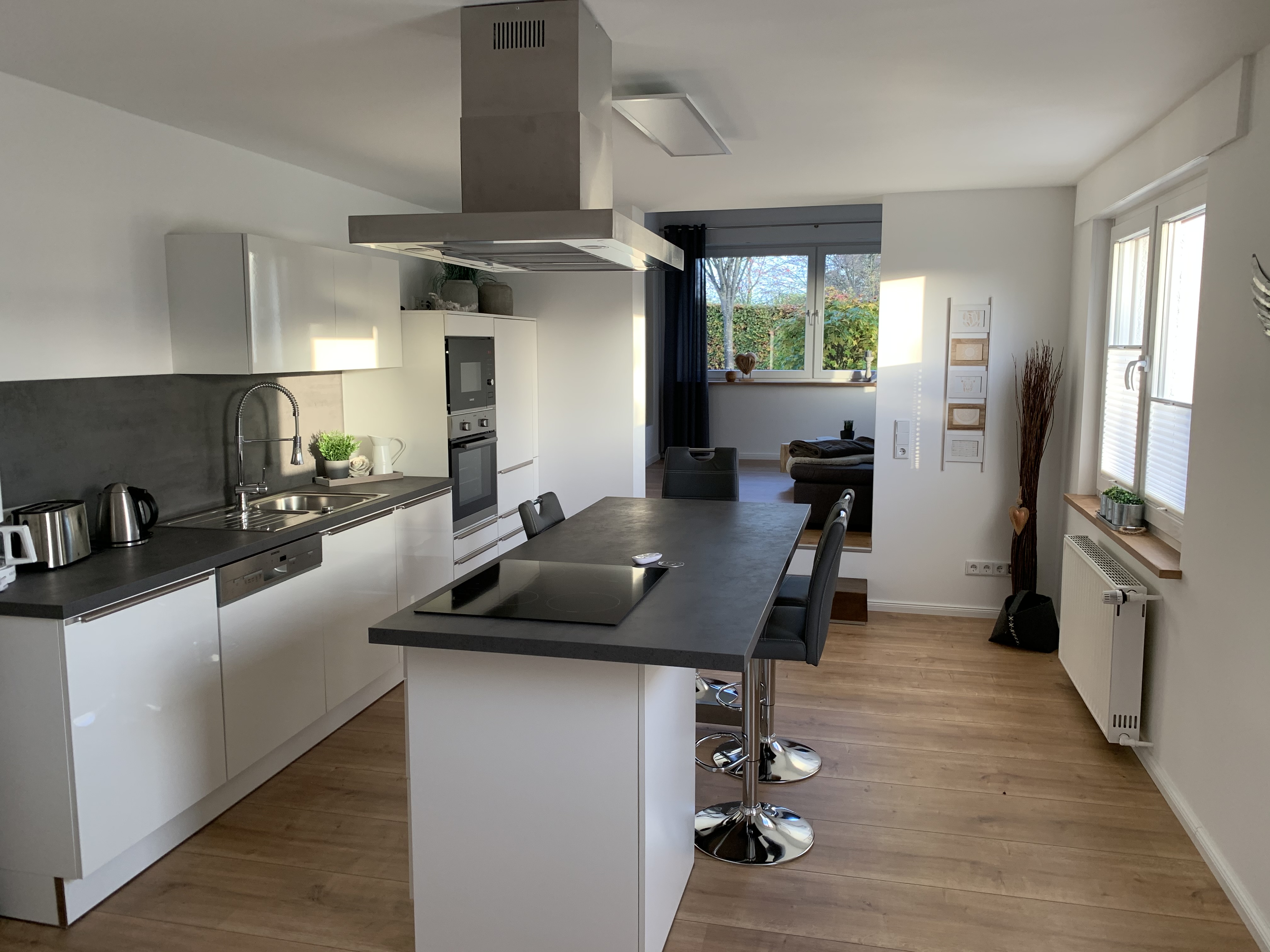 Unser schönes und modernes Apartment ist voll möbliert und bietet auf ca. 64 qm ausreichend Platz zum Wohlfühlen für bis zu vier Personen. Es befindet sich im Erdgeschoss unseres Einfamilienhauses und ist über einen separaten Eingang mit zwei Stufen erreichbar.