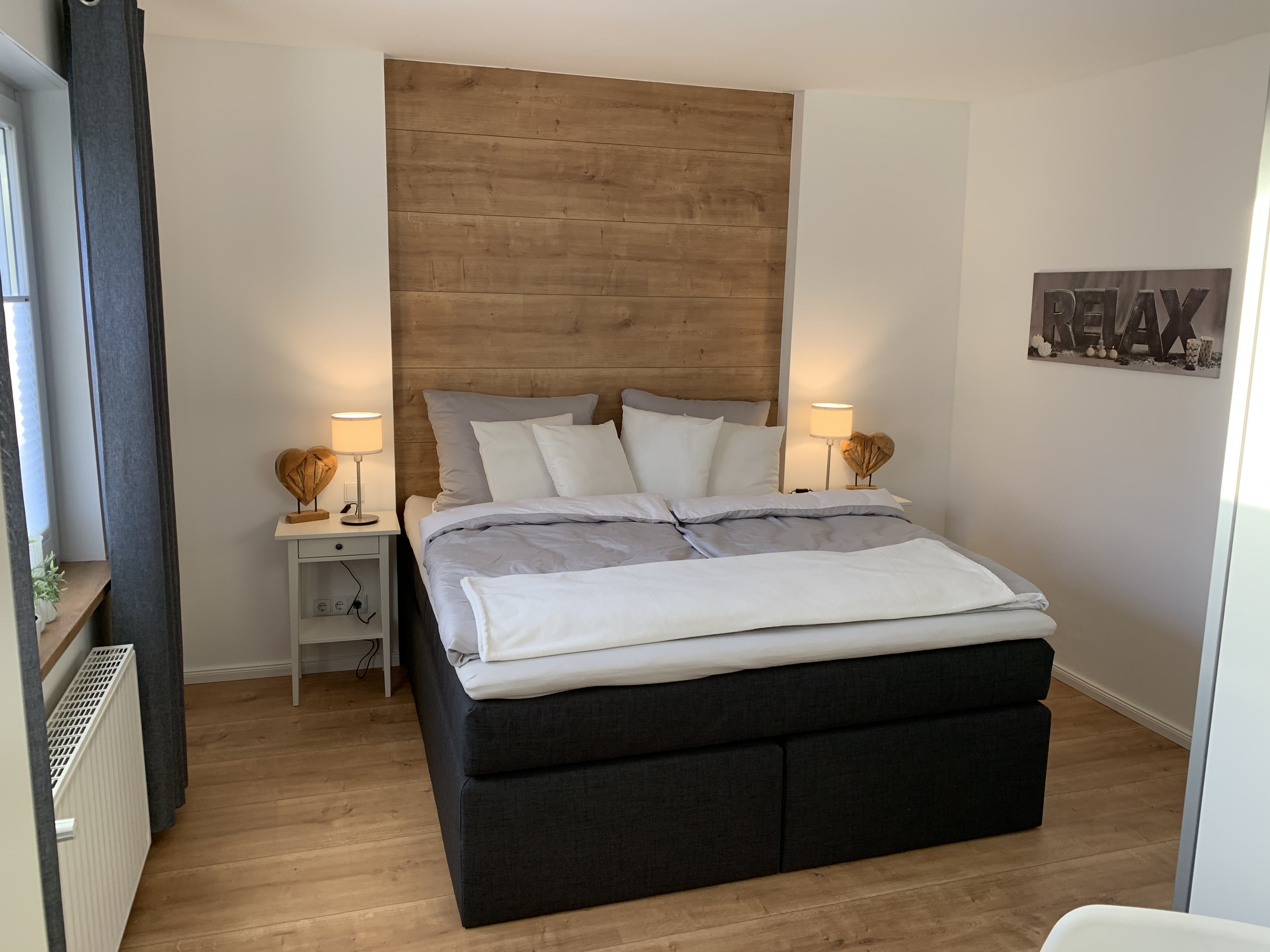 Im Schlafzimmer sorgen ein gemütliches Boxspringbett (180 x 200 cm) sowie ein geräumiger Kleiderschrank für Komfort und ausreichend Stauraum. Zudem besteht die Möglichkeit, Wäsche zu waschen, aufzuhängen und zu bügeln.